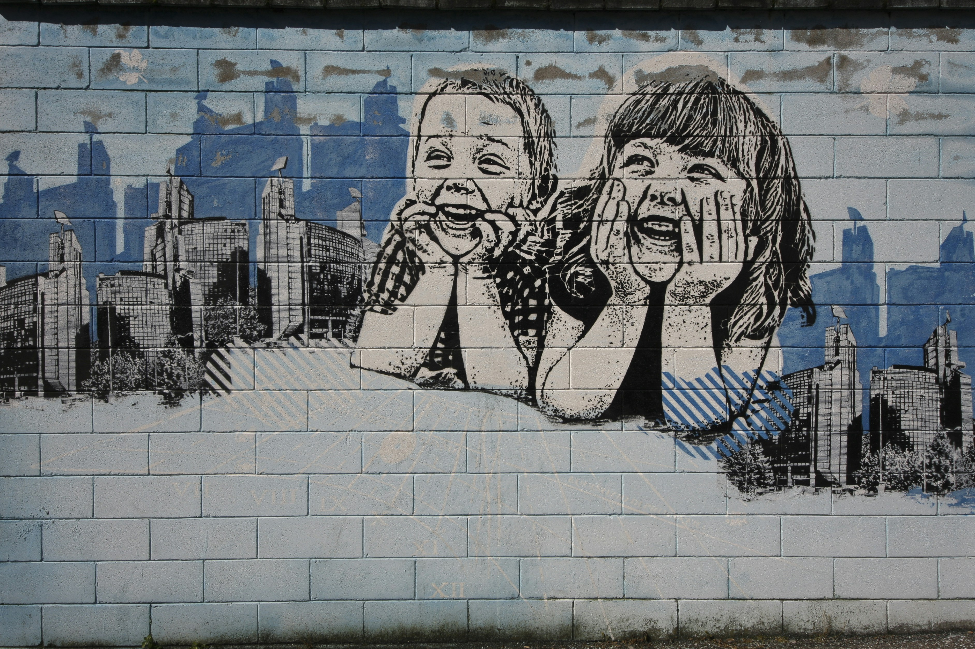 A dark-skinned male leaping along the sidewalk in front of an abstractly painted wall.